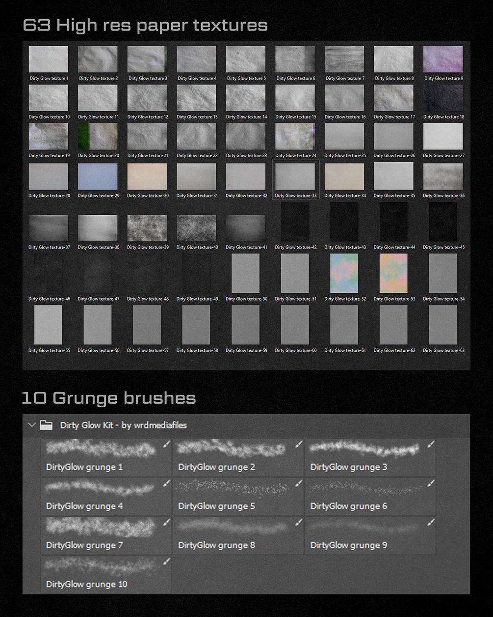- 63 high-res paper textures (36–63 are tuned for the dirty glow effect)